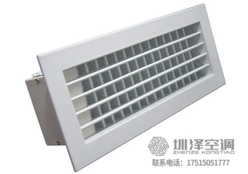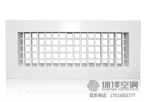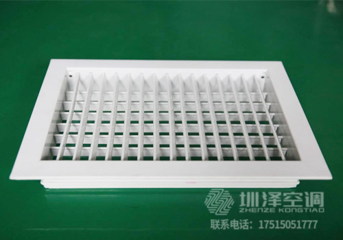 雙層百葉風口由雙層葉片組成,前面一層葉片是可調(diào)的,后面一層葉片是固定的,根據(jù)需要可配置對開式多葉風量調(diào)節(jié)閥,用來調(diào)節(jié)風口風量。凡前面葉片為豎向布置、后面葉片為橫向布置的稱為VH式。通過改變豎葉片的安裝角度,可調(diào)整氣流的擴散角。例如,設在賓館客房小過道內(nèi)的臥式暗裝風機盤管機組的出風口,通常是采用VH式雙層百葉風口的。