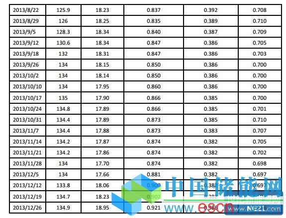 2013 年國際多晶硅現(xiàn)貨價格同國內(nèi)價格一致也呈先揚后抑的走勢,從年初15.35美元 /千克溫和增長至 4 月初的 18.6 美元/千克,增幅為 21.2%。4 月中旬進口價格逐漸走低, 于 6 月中旬下滑至 16.25 美元/千克,隨后微幅上漲至 16.63 美元/千克且兩個月內(nèi)維持不 變,之后進口多晶硅價格在 18.1 美元/千克左右徘徊。受多晶硅價格影響,硅片價格也隨 之波動,其中,156mm多晶硅片周均價從年初 0.807 美元/片緩慢增長至4 月中旬的 0.852 美元/片,增幅為 5.6%,4 月中旬 156mm 硅片價格開始逐漸走低,降至 9 月初的 0.84 美 元/片,從9月中旬開始硅片價格一路上漲至 12 月底的 0.921 美元/片;而受歐盟對華光伏 產(chǎn)品“雙反”影響,上半年電池片和組件的價格呈現(xiàn)上漲趨勢,其中 156mm 多晶硅電池 片周均價從年初的 0.341 美元/瓦,增至6 月初的 0.414 美元/瓦,增幅為21.4%,隨后一路 下滑至 12 月底的 0.386 美元/瓦,降幅為 6.8%;晶硅組件周均價從 1 月初的 0.654 美元/ 瓦一路上漲至 6 月底的 0.733 美元/瓦,增幅為12.1%。但是 6 月份之后,國際市場特別是 歐盟地區(qū)需求開始減弱,多晶硅電池片震蕩回落至 0.696 美元/瓦,但是跌幅為 5%(附表 1)