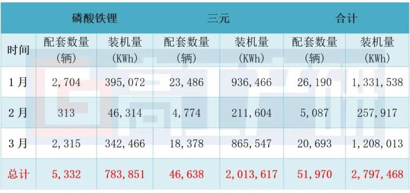 其中,三元動力電池合計配套新能源汽車約4.7萬輛,同比下降55%,裝機(jī)量合計約2.0GWh,同比下降52%;磷酸鐵鋰動力電池合計配套新能源汽車約0.5萬輛,同比下降29%,裝機(jī)量合計約0.80GWh,同比下降38%。