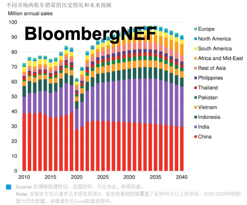 中國儲能網訊:全球兩輪車市場快速增長。2019年,全球共售出8300萬輛輕便摩托車、滑板車和摩托車,兩輪車保有量升至9.21億輛。電動兩輪車在兩輪車市場占比為30%,比電動乘用車在汽車市場的份額高得多。迄今為止,政策一直是電氣化的主要動力,但隨著兩輪車的經濟性不斷改善,制造商對兩輪車的興趣漸增,兩輪車電氣化也不斷推進。在本報告中,我們提出了對全球30個主要市場中燃油助力車和電動兩輪車銷量和保有量的增長預測。