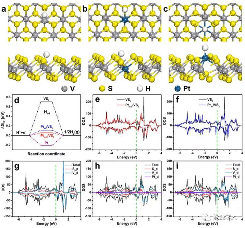 最后,對樣品的催化活性提升進行了相關(guān)機理分析。圖5(a-c)分別為單純VS2,Pt摻雜VS2和Pt吸附VS2的氫原子化學吸附模型。通過計算可以得到其相應(yīng)的氫吸附自由能如圖5(d)所示,可以發(fā)現(xiàn)Pt的引入,無論是以取代V原子形式存在或是以吸附在VS2表面的形式存在,氫吸附自由能都比單純的VS2和單純的Pt更加接近于熱中性值,更加有利于氫吸附和解吸過程,從而增強電催化析氫性能。同時通過對比DOS也可以發(fā)現(xiàn)(圖5(e-i)),Pt摻雜或吸附后,費米面附近的態(tài)密度有所增強,意味著能夠有更多的電荷參與到反應(yīng)中,也對于提升電催化析氫活性有所幫助。
