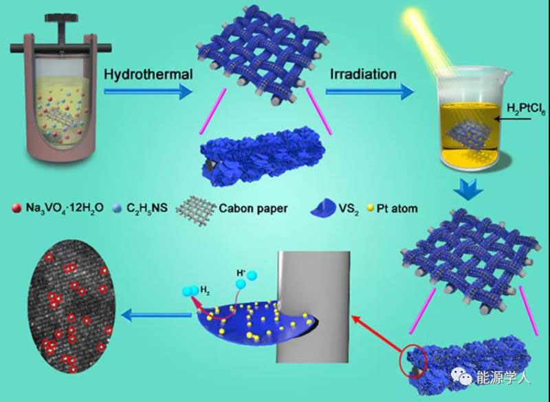 利用VS2為基礎(chǔ)的電催化劑來提高HER的整體性能已有大量研究,但據(jù)我們所知,目前還沒有系統(tǒng)的研究將不同的Pt形態(tài)尤其是單原子Pt加入到VS2中來考察它們對HER的影響。因此,研究人員以VS2為基礎(chǔ)材料,對其進行了鉑單原子修飾,從而得到了催化性能十分優(yōu)異且成本低廉的復合電催化劑材料。首先,通過一步水熱法在碳紙上原位生長了VS2納米片。然后,將長有VS2納米片的碳紙與不同濃度的氯鉑酸溶液充分混合均勻,碳紙兩面分別在氙燈光源下照射一段時間即可得到不同鉑形態(tài)修飾的VS2納米片。通過控制氯鉑酸濃度和照射時間即可得到單原子鉑修飾的二硫化釩催化劑。
