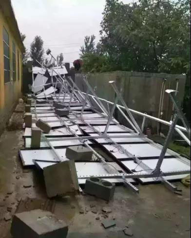 以抗傾覆設(shè)計(jì)舉例,屋面光伏項(xiàng)目需要設(shè)計(jì)的抗傾覆系數(shù)是1.6,也就是說(shuō)要設(shè)計(jì)的抗傾覆彎矩是傾覆彎矩的1.6倍,才能滿(mǎn)足安全要求。因此,圖3電站中的抗傾覆彎矩大概需要設(shè)計(jì)到952千牛米,才是安全的。而屋面電站的結(jié)構(gòu)事故許多也是因?yàn)榭箖A覆設(shè)計(jì)不足造成的,如下圖: