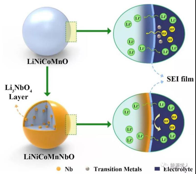 通過(guò)以上表征分析,可以總結(jié)出Nb摻雜富鋰錳基正極材料改善的電化學(xué)性能原因:(1)Nb–O鍵的結(jié)合能強(qiáng)于Mn–O、Co–O和Ni–O的,有利于穩(wěn)定材料結(jié)構(gòu)并抑制脫鋰過(guò)程中的O逸出。(2)在鋰混合階段摻入Nb可使Nb元素不僅摻入材料的結(jié)構(gòu),而且可以在材料表面形成Li3NbO4相;其中結(jié)構(gòu)中的Nb元素可進(jìn)一步穩(wěn)定材料,表面上的Li3NbO4相可以防止表面電解質(zhì)中產(chǎn)生HF,從而避免直接侵蝕。另外,作為鋰離子導(dǎo)體Li3NbO4可以提高鋰離子擴(kuò)散速率。因此,可以減少過(guò)渡金屬在電解質(zhì)中的溶解(示意圖1)。