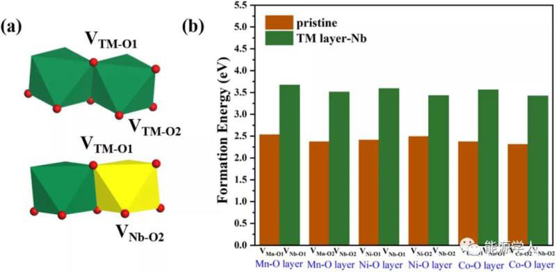 Nb被認(rèn)為是Li2MnO3中替代Mn的最合適元素,因?yàn)镹b–O鍵的結(jié)合能比Mn–O的更強(qiáng),有利于抑制脫鋰過(guò)程中的O析出。此外,與Mn4+相比,具有較大離子半徑的Nb5+可以擴(kuò)展晶格參數(shù)。已有一些關(guān)于Nb元素?fù)诫s到正極材料中的報(bào)道。然而,這些研究旨在改善正極材料的電化學(xué)性能,很少解釋改善正極材料電化學(xué)性能的機(jī)理,特別是使用基于第一性原理計(jì)算的密度泛函理論(DFT)。
