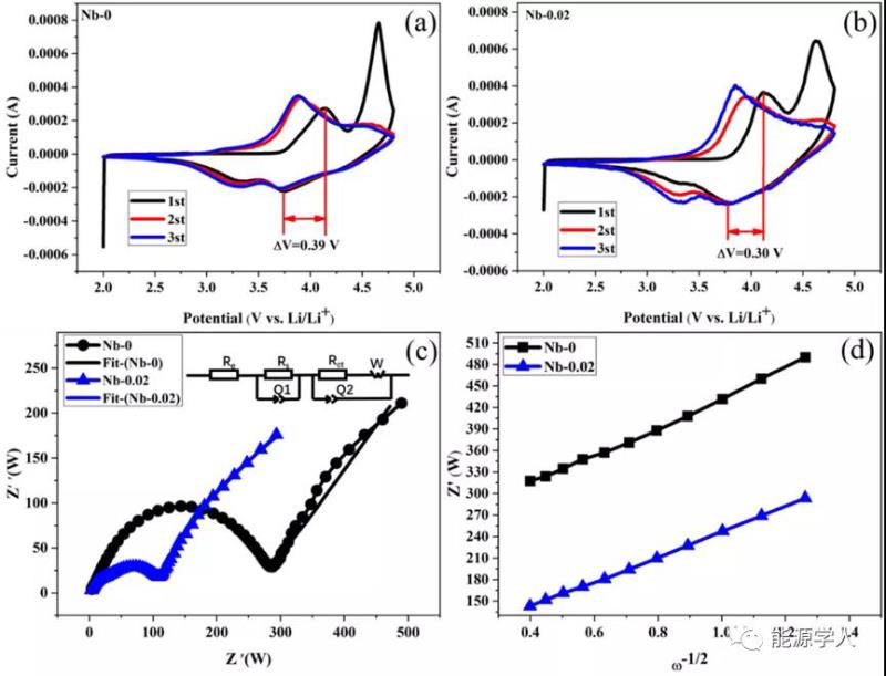 圖5. 原始和Nb摻雜Li1.2Ni0.13Co0.13Mn0.54O2的CV和EIS分析:(a, b)Nb-0和Nb-0.02的CV分析,(c, d)Nb-0和Nb-0.02的EIS分析。