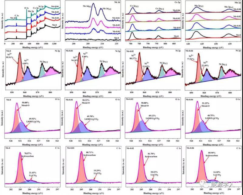 圖3. XPS全譜:Nb-0、Nb-0.01、Nb-0.02和Nb-0.04的Nb 3d、Co 2p、Mn 2p、Ni 2p、O 1s和C 1s光譜。
