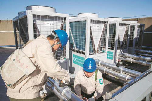 工作人員在江蘇靖江國際大酒店頂層檢查氣能循環(huán)泵進(jìn)出水閥門運(yùn)行情況。
