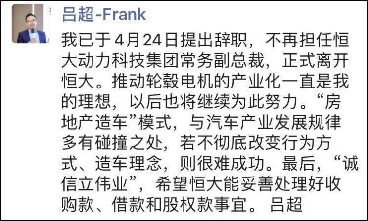 一則高管離職的糾紛將恒大造車再次推向公眾視野。5月5日晚間,恒大動力科技集團(tuán)常務(wù)副總裁呂超發(fā)布朋友圈表示,其已于2020年4月24日向公司提出辭職,并評價稱,恒大的“房地產(chǎn)造車”模式與汽車產(chǎn)業(yè)發(fā)展規(guī)律多有碰撞之處,若不徹底改變行為方式、造車?yán)砟?,則很難成功。