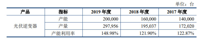 錦浪科技表示,項(xiàng)目建設(shè)有利于提高產(chǎn)能,滿足不斷增長的市場需求。近年來錦浪科技產(chǎn)品銷售增長較快,2017年度、2018年度、2019年度,公司營業(yè)收入分別為8.235億元、8.314億元以及11.39億元,2017年至2019年?duì)I業(yè)收入年均復(fù)合增長率為17.61%。2019年全年?duì)I業(yè)收入相較于上市前2018年度增長37.01%,增幅快速擴(kuò)大。2017年至2019年,錦浪逆變器產(chǎn)能、產(chǎn)量及產(chǎn)能利用率統(tǒng)計(jì)情況如下: