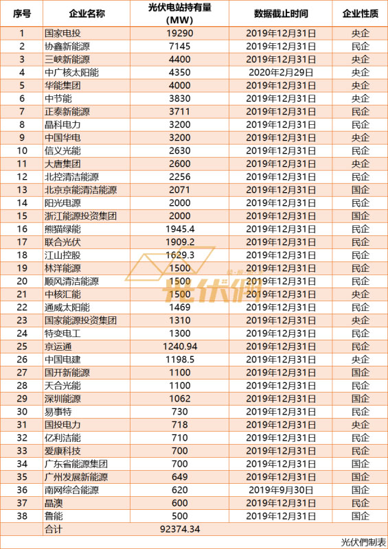 2019年底,中國(guó)光伏累計(jì)裝機(jī)突破200GW大關(guān),而光伏電站的投資格局也在悄然發(fā)生著變化,光伏電站的聚集度正逐漸提高。光伏們根據(jù)2019年光伏企業(yè)陸續(xù)公布的財(cái)報(bào)、央企的社會(huì)責(zé)任報(bào)告以及采訪調(diào)研,統(tǒng)計(jì)了38家光伏電站投資商截止到2019年底的電站持有量業(yè),總計(jì)約92.4GW,占國(guó)內(nèi)總裝機(jī)的45.23%左右。