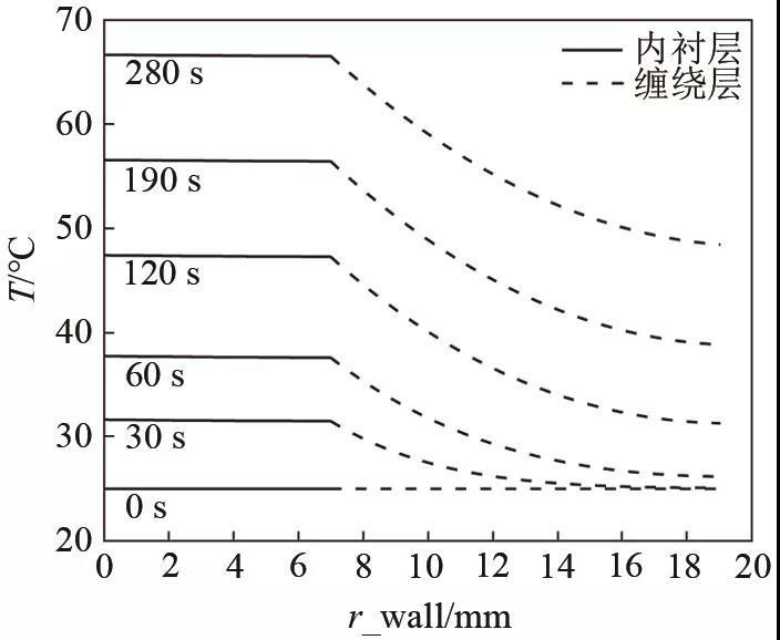 為進(jìn)一步考察內(nèi)襯層和纏繞層在加氫過程中的換熱行為,對儲(chǔ)氫瓶壁面的徑向溫度分布隨時(shí)間的變化進(jìn)行研究,結(jié)果如圖3所示。加注起始時(shí)刻(t=0 s時(shí)刻),儲(chǔ)氫瓶壁面沿徑向溫度一致,加注30s后,內(nèi)襯層溫度升高,在7 mm徑向厚度內(nèi)基本無溫度梯度。相比之下,纏繞層在徑向出現(xiàn)明顯的溫度梯度,其內(nèi)壁和外壁溫差已經(jīng)達(dá)到約6 ℃。隨著加氫時(shí)間的進(jìn)行,瓶內(nèi)氫氣與壁面發(fā)生換熱,導(dǎo)致內(nèi)襯層溫度逐漸升高,與此同時(shí),其徑向仍然無明顯的溫度梯度,說明內(nèi)襯層材料導(dǎo)熱快;纏繞層沿徑向表現(xiàn)出更加顯著的溫度梯度,當(dāng)加注結(jié)束時(shí),纏繞層的內(nèi)外壁溫差已提高至8 ℃,這是纏繞層材料導(dǎo)熱較慢所致。另一方面,加注結(jié)束時(shí),儲(chǔ)氫瓶外壁溫度為48 ℃,與室溫形成了23 ℃溫差,這是由于瓶壁向環(huán)境散熱受到自然對流過程控制,加注時(shí)間內(nèi)散熱量很小。因此,加氫過程中,儲(chǔ)氫瓶內(nèi)氫氣對外散熱經(jīng)內(nèi)襯層的導(dǎo)熱速度快,在纏繞層導(dǎo)熱慢、形成顯著的溫度梯度,瓶外壁與環(huán)境的換熱量很小,儲(chǔ)氫瓶壁面各層材料的厚度和導(dǎo)熱特性對加氫溫升有重要影響。