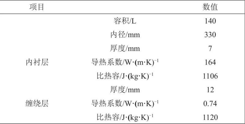 國內(nèi)典型III型儲(chǔ)氫瓶的結(jié)構(gòu)參數(shù)如表1所示,仿真結(jié)果表明,加氫結(jié)束后儲(chǔ)氫瓶內(nèi)氫氣溫度為73.5 ℃,溫升48.5 ℃。氫氣加注過程中儲(chǔ)氫瓶內(nèi)氫氣溫度逐漸升高,向儲(chǔ)氫瓶壁面散熱,首先與內(nèi)壁發(fā)生傳熱使得鋁內(nèi)膽內(nèi)襯溫度升高,然后內(nèi)襯層將熱量傳導(dǎo)至纏繞層,最后經(jīng)外壁面散熱至環(huán)境。在氫氣加注的280 s時(shí)間內(nèi),儲(chǔ)氫瓶內(nèi)氫氣對壁面的總散熱量為2317 kJ,其中鋁內(nèi)膽內(nèi)襯吸收熱量1319 kJ,碳纖維纏繞層吸收熱量956 kJ,經(jīng)儲(chǔ)氫瓶壁面向環(huán)境散熱量42 kJ,這說明加氫過程中瓶內(nèi)氫氣的換熱量有98%被儲(chǔ)氫瓶體吸收,僅有2%熱量散出儲(chǔ)氫瓶,因此,儲(chǔ)氫瓶壁面的導(dǎo)熱特性對加氫溫升有直接影響。