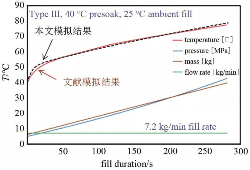 根據(jù)美國能源部公布的III型瓶加氫結(jié)果[6],采用相同的儲(chǔ)罐參數(shù)和加注條件,模擬獲得的氫氣溫升曲線與文獻(xiàn)報(bào)道值基本重合(圖2),說明建立的仿真模型具有可靠性。