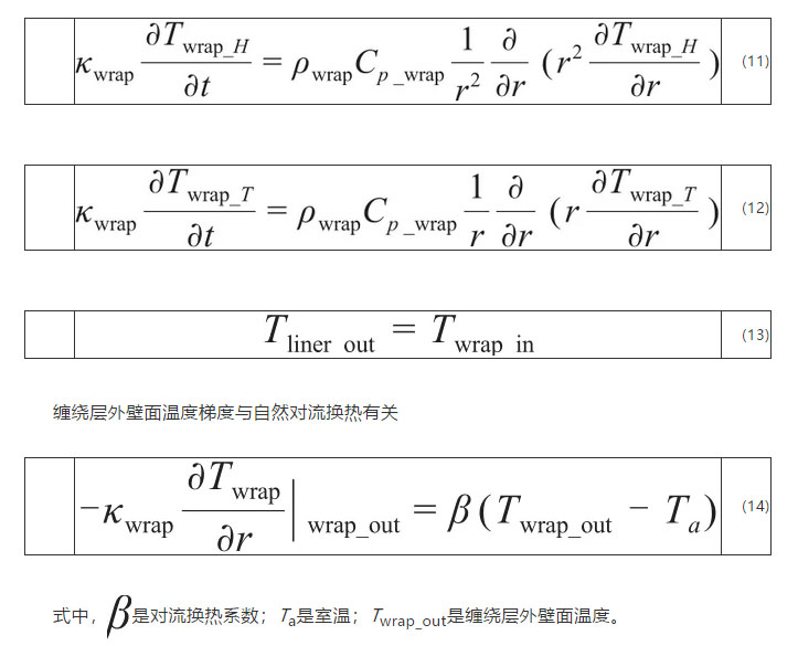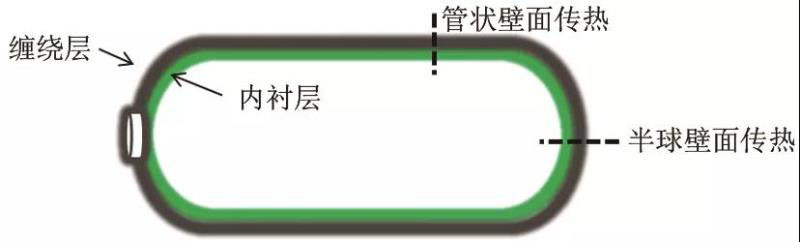 為獲得加氫過程中瓶內(nèi)氫氣溫度的變化,還需要求解出瓶內(nèi)氫氣的散熱量。假設(shè)儲(chǔ)氫瓶是兩端半球、中間管狀的結(jié)構(gòu),氫氣經(jīng)壁面對外散熱時(shí),瓶壁只存在徑向的溫度梯度。瓶壁包括內(nèi)襯和纏繞兩層,如圖1所示。