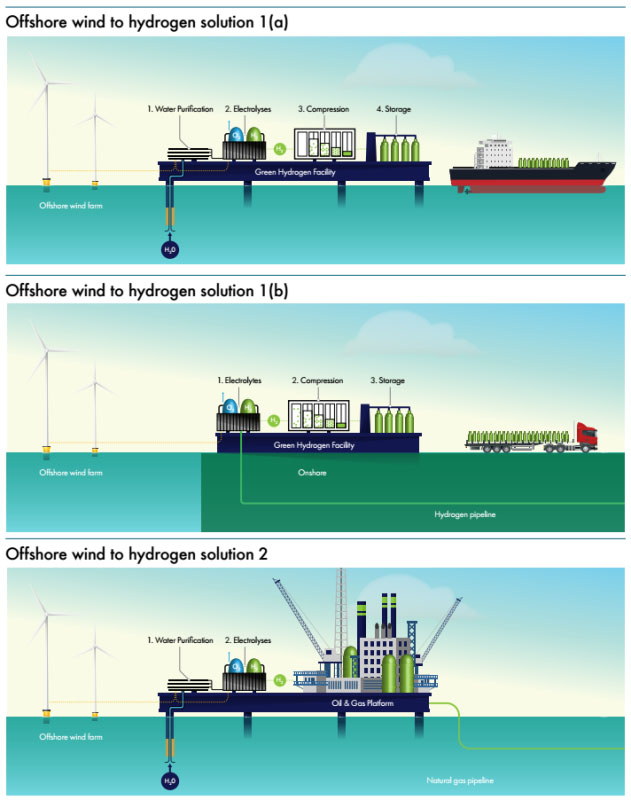 實(shí)現(xiàn)氣候目標(biāo)的關(guān)鍵是海上風(fēng)電制氫。在所有可再生能源制氫的選擇中,海上風(fēng)電最有潛力,它的規(guī)模和技術(shù)創(chuàng)新帶來了很強(qiáng)的經(jīng)濟(jì)競爭力,成本在過去幾年不斷下降。目前,被廣泛開發(fā)的海上風(fēng)電制氫解決方案有兩種,如下圖所示。第一種方案中,過剩的海上風(fēng)電將用來電解水產(chǎn)生氫氣和氧氣,氫氣被壓縮、存儲、轉(zhuǎn)運(yùn)。如果有海上氫化平臺,還可以就地轉(zhuǎn)化為合成天然氣或氨?;?qū)㈦娊庋b置布置在岸上,氫氣直接通過管道或卡車運(yùn)輸。另一種方案是將電解裝置布置在海上油氣平臺上,利用多余的海上風(fēng)電電解水制氫,然后將氫氣混進(jìn)已有的天然氣管線進(jìn)行運(yùn)輸,預(yù)計(jì)天然氣中可以混入最多20%體積的氫氣。目前歐洲、澳大利亞已有不少綠氫項(xiàng)目正在規(guī)劃建設(shè)中。