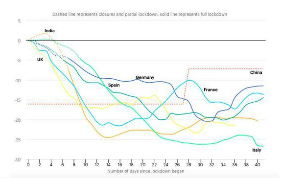 實施封鎖政策后,各國用電需求量減少比例。(數(shù)據(jù)來源:國際能源署)