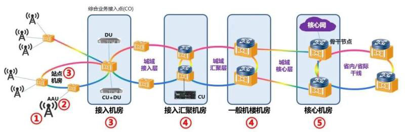 共建共享范疇不只局限于站址資源及社會(huì)桿塔資源層面的共建共享,根據(jù)資源層級(jí)可以劃分共建共享的程度和等級(jí)——通信網(wǎng)絡(luò)分為接入網(wǎng)、承載網(wǎng)、核心網(wǎng),包括如圖1所示的幾個(gè)層面資源:塔、桿、屋頂、平臺(tái)(物業(yè)),天線(AAU、RRU、天線饋線),站點(diǎn)機(jī)房、接入機(jī)房(BBU、DU、CU、傳輸設(shè)備資源、電力、空調(diào)),匯聚機(jī)房、一般機(jī)樓機(jī)房(傳輸設(shè)備資源),核心機(jī)房(核心網(wǎng)設(shè)備)。