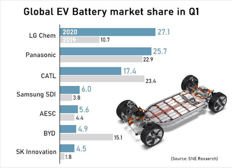 動力電池市場調(diào)研機構(gòu)SNE Research日前發(fā)布的一份報告顯示,今年第一季度,全球電動汽車動力電池市場頭名易主,韓國LG化學的動力電池裝機量超過中國寧德時代、日本松下,奪得首位。