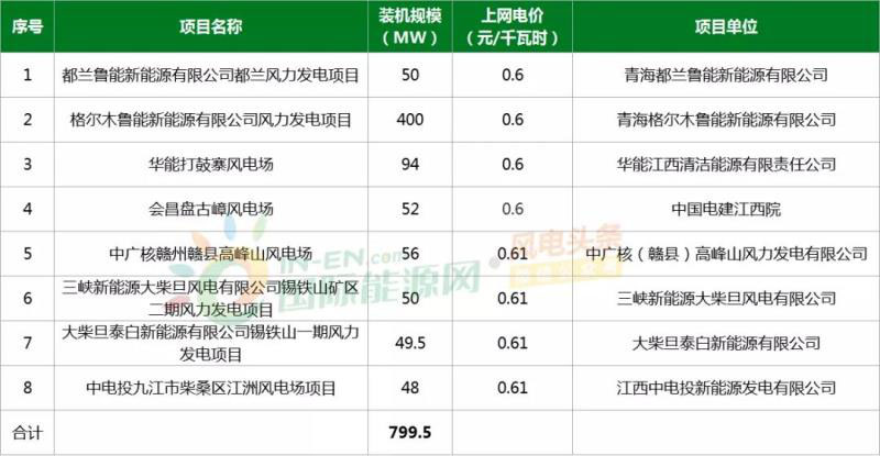 近日,江西省、青海省發(fā)改委分別公布了8個風電項目上網(wǎng)電價,總裝機容量799.5MW ,上網(wǎng)電價為0.6-0.61元/千瓦時。