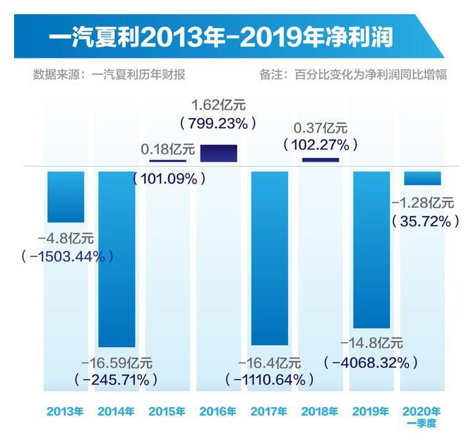 實際上,一汽夏利的危機由來已久。4月8日,一汽夏利發(fā)布2019年年報,全年營業(yè)收入4.29億元,與2018年同期相比減少61.85%;歸屬于母公司股東的凈利潤虧損14.81億元,同比下滑4068.32%。次日,一汽夏利股票停牌一天。4月10日復牌后,一汽夏利“披星戴帽”變更為“*ST夏利”。