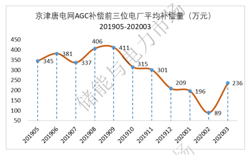 選取京津唐電網(wǎng)2019年5月-2020年3月間,各月補(bǔ)償量排名前三的電廠,取三者月度補(bǔ)償量的平均值。與京津唐電網(wǎng)AGC總補(bǔ)償量趨勢相似,各個(gè)電廠獲得的補(bǔ)償量也呈下降趨勢。2020年,最低2月份只有89萬,1月和3月在200萬左右。