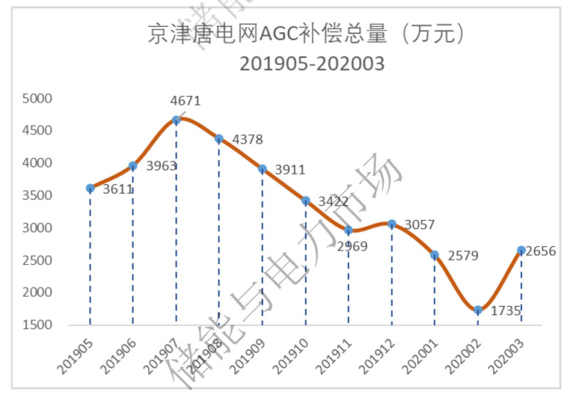 2019年5月-2020年3月京津唐調(diào)頻輔助服務(wù)市場的總補(bǔ)償情況如下圖所示。京津唐調(diào)頻輔助服務(wù)的總補(bǔ)償量(萬元)整體呈下降趨勢。2019年7月達(dá)到最近的補(bǔ)償高峰,4671萬元,2020年2月補(bǔ)償量最小,1735萬元。