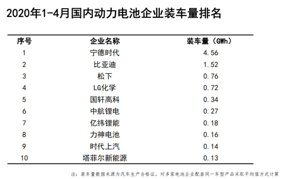 此外,2020年1-4月,我國動力電池裝車量排名前十的企業(yè)分別是寧德時代、比亞迪、松下、LG化學(xué)、國軒高科、中航鋰電、億緯鋰能、力神電池、時代上汽、塔菲爾新能源。