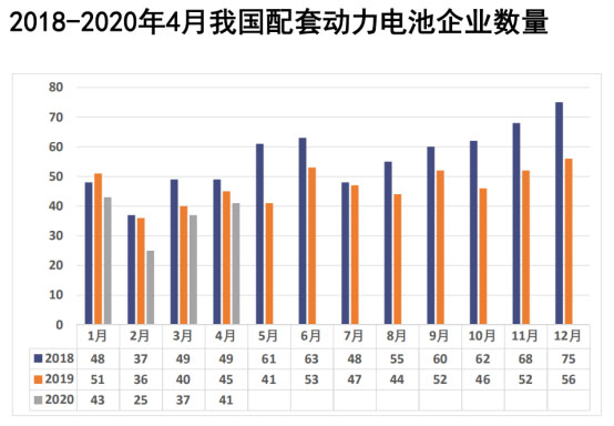 實現(xiàn)裝車配套方面,2020年4月,我國新能源汽車市場共計41家動力電池企業(yè)實現(xiàn)裝車配套,較3月份增加了4家,較2019年4月減少了4家,較2018年4月減少了8家。