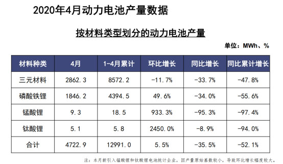 此外,2020年1-4月,我國三元電池產(chǎn)量累計為8.6GWh,占總產(chǎn)量66.0%,同比累計下降47.8%;磷酸鐵鋰電池產(chǎn)量累計為4.4GWh,占總產(chǎn)量33.8%,同比累計下降55.6%。