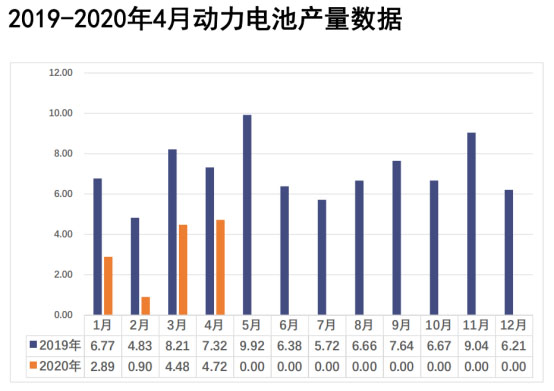 2020年4月,我國動力電池產(chǎn)量共計4.7GWh,環(huán)比3月的4.5GWh上升了5.5%,同比2019年4月的7.3GW下降了35.5%。此外,2020年1-4月,我國動力電池產(chǎn)量累計13.0GWh,同比累計下降52.1%。