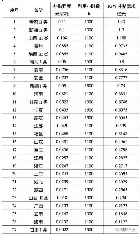部分補(bǔ)貼較高的省份,如果補(bǔ)貼下降0.05元/kWh(即自發(fā)自用分布式、10省區(qū)實(shí)現(xiàn)無(wú)補(bǔ)貼)時(shí),其他省份1GW仍然需要的補(bǔ)貼額計(jì)算如下表所示。