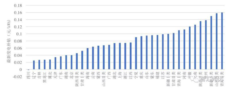 先來(lái)看一下現(xiàn)有指導(dǎo)電價(jià)下,各省、地區(qū)的補(bǔ)貼強(qiáng)度,在-0.0012元/kWh~0.16元/kWh之間,如下圖所示。