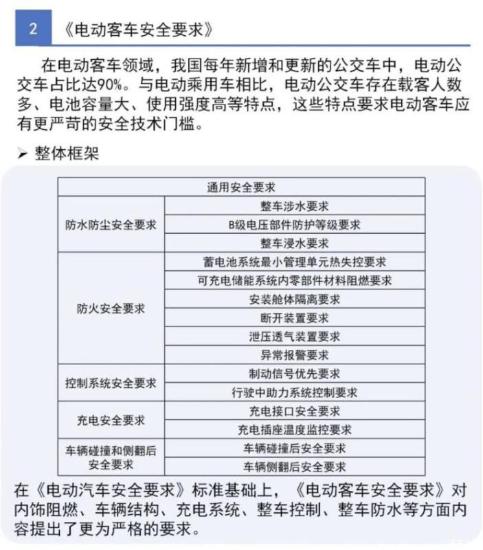 《電動客車安全要求》針對電動客車載客人數(shù)多、電池容量大、驅動功率高等特點,在《電動汽車安全要求》標準基礎上,對電動客車電池倉部位碰撞、充電系統(tǒng)、整車防水試驗條件及要求等提出了更為嚴格的安全要求,增加了高壓部件阻燃要求和電池系統(tǒng)最小管理單元熱失控考核要求,進一步提升電動客車火災事故風險防范能力。