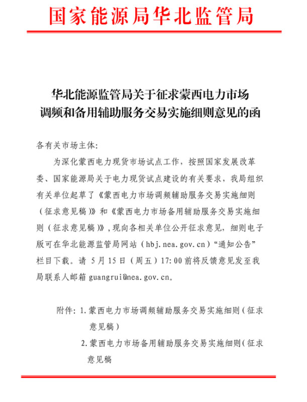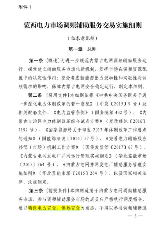 近日,華北能監(jiān)局發(fā)布《蒙西電力市場(chǎng)調(diào)頻和備用輔助服務(wù)交易實(shí)施細(xì)則征求意見稿》。