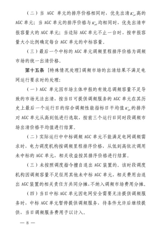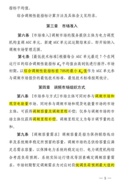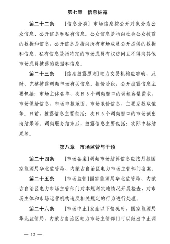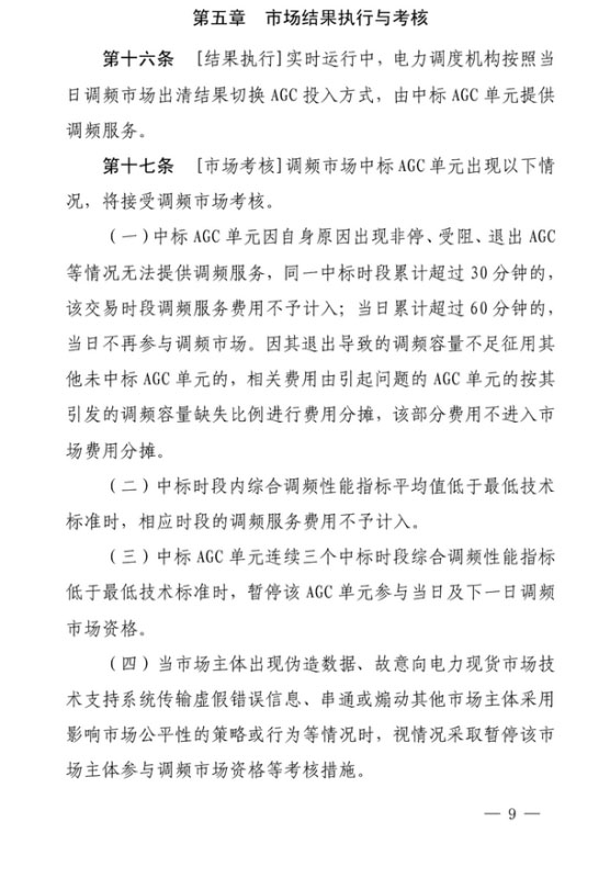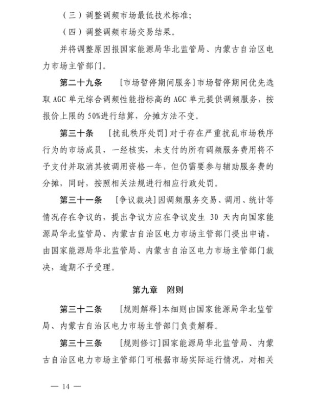 其中,《蒙西電力市場(chǎng)調(diào)頻輔助服務(wù)交易實(shí)施細(xì)則》征求意見稿共九章三十五條,這份征求意見稿與廣東市場(chǎng)現(xiàn)行規(guī)則有很多相似之處,分別對(duì)市場(chǎng)成員、交易要求、組織實(shí)施、考核、結(jié)算、信息披露及市場(chǎng)監(jiān)管等事項(xiàng)進(jìn)行了明確和界定。