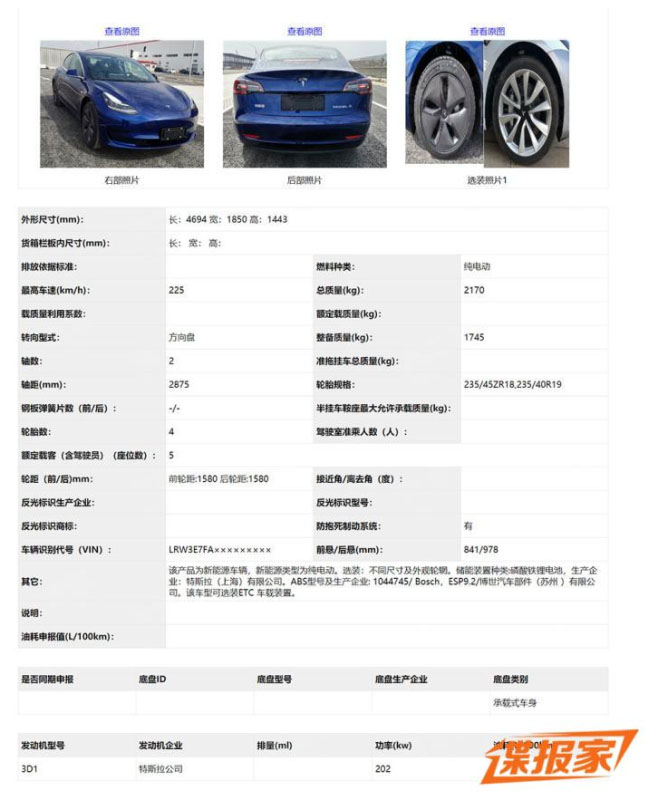 從申報(bào)圖來看,特斯拉Model 3的外觀并未發(fā)生變化;申報(bào)信息一欄中,車身長寬高尺寸分別為4694mm/1850mm/1443mm,軸距為2875mm,新車電動(dòng)機(jī)型號為3D1,最大功率為202kW,均與現(xiàn)款車型保持一致。
