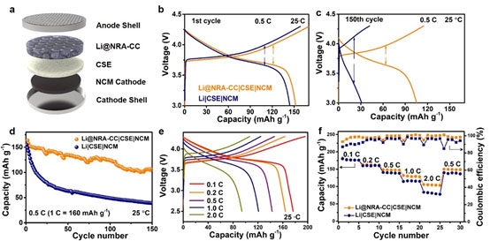 圖6. Li@NRA-CC匹配有機(jī)-無(wú)機(jī)復(fù)合固體電解質(zhì)的室溫固態(tài)電池性能: (a) 固態(tài)電池結(jié)構(gòu)示意圖;(b-c) 0.5 C倍率下第1圈和第150圈充放電曲線對(duì)比;(d) 0.5 C循環(huán)性能圖;(e-f) 倍率性能。