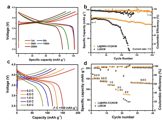 圖5. Li@NRA-CC匹配高電壓正極LiNi0.5Co0.2Mn0.3O2的液態(tài)全電池性能:(a-b) 1C倍率下充放電曲線和容量-循環(huán)圖;(c-d)倍率充放電曲線和容量-循環(huán)圖。