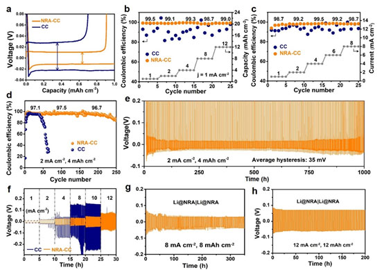 圖4. NRA-CC在半電池和對(duì)稱電池中的表現(xiàn):(a) NRA-CC和未處理碳布(簡(jiǎn)記為CC)的充放電曲線對(duì)比;(b-c) 不同電流密度和不同面容量條件下半電池庫(kù)倫效率;(d-e) 在2 mA cm-2, 4 mAh cm-2下半電池循環(huán)性能及t-V曲線;(f-h) 對(duì)稱電池性能。
