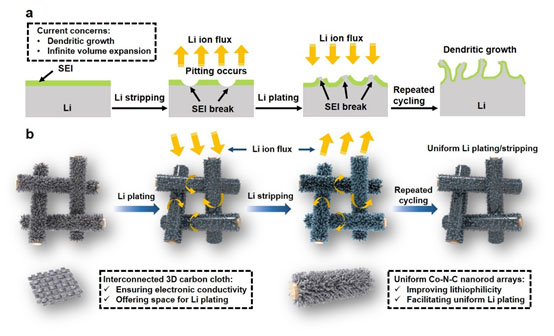 圖2. NRA-CC枝晶抑制機(jī)理示意圖:(a) 金屬鋰負(fù)極產(chǎn)生枝晶的成因分析;(b) NRA-CC對(duì)鋰沉積剝離過(guò)程的調(diào)控作用。