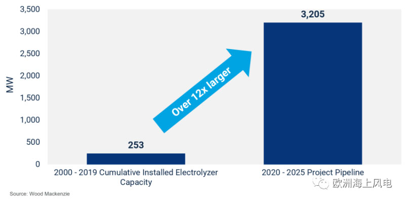 盡管”綠色氫氣“目前缺乏成本競爭力,但預測將來仍將是一個增長的市場。這也是為什么看到某國雖然退出巴黎協(xié)定,但還是要支持”綠色氫氣”的原因。整體來看,從2000年到2019年底,共部署了253兆瓦的綠色氫氣項目。但到2025年,全球范圍內將會再部署3205 兆瓦的綠色氫氣項目,較此前增長了1272%。