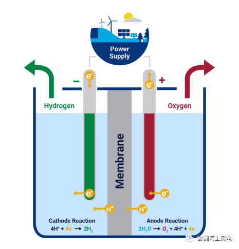 除了上面說的制氫工藝,氫氣也可以通過電解水(使用電流將水分解為氫和氧)來產生。任何資源生產的電力都能用來電解水制氫氣,如果此時使用的電能是由可再生能源(例如太陽能或風電)產生的,在生產過程中將基本上不會產生溫室氣體,因此我們把這種方式生成的氫氣叫“綠色氫氣”??稍偕茉措娊庵茪溥^程示意圖如下.