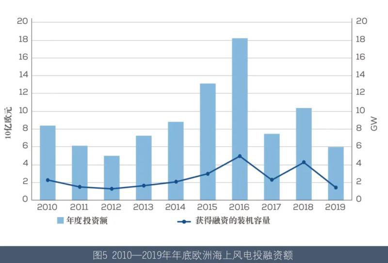 2019 年,歐洲海上風(fēng)電新增投資60 億歐元(約合人民幣462.42 億元),比2018 年減少了40%??紤]到每年達成最終投資決策(FID)的大型海上風(fēng)電場數(shù)量較少,且國家間投資框架存在差異,該數(shù)據(jù)會逐年波動。