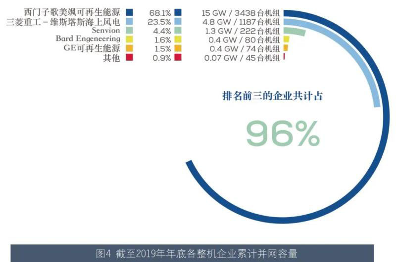 在累計并網(wǎng)容量占比方面,SGRE位居第一,占68.1% ;三菱重工--維斯塔斯排名第二,占23.5% ;其次是Senvion,占4.4%。到2019 年年底,這三家整機商合計占歐洲全部海上風(fēng)電裝機的96%。