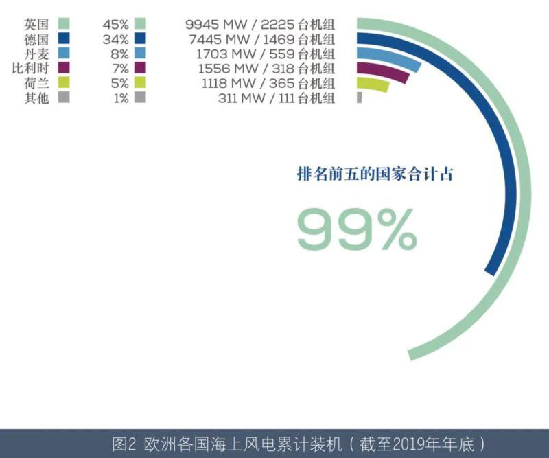 截至2019 年年底,歐洲共安裝5047 臺海上風(fēng)電機組,累計裝機容量為22072MW。排名前五的國家所占份額達99%,分別是英國(45%)、德國(34%)、丹麥(8%)、比利時(7%)和荷蘭(5%)。