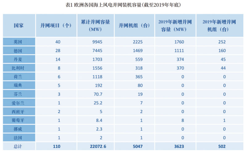 2019 年,歐洲海上風(fēng)電新增并網(wǎng)容量3623MW,增加502 臺海上風(fēng)電機組(凈新增裝機容量3627MW),涉及10 個風(fēng)電場。截至2019年年底,歐洲海上風(fēng)電累計裝機容量為22072MW,共有5047 臺風(fēng)電機組并網(wǎng),分布于12 個國家。另外,英國拆除了2臺2MW機組。