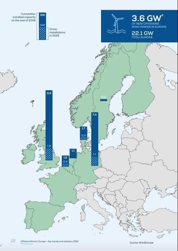歐洲風(fēng)能協(xié)會(WindEurope)發(fā)布的2019歐洲海上風(fēng)電報告顯示,2019年,歐洲新增502臺海上風(fēng)力發(fā)電機組,涉及10個已成功并網(wǎng)的海上風(fēng)電項目,新增裝機容量共計3627MW,海上風(fēng)電機組平均單機容量達7.8 MW。2019年,4個新的海上風(fēng)電項目在4個不同的國家達成了最終決定投資(FID),總計投資60億,1.4GW的裝機容量,未來幾年將開始建設(shè)。以下為《風(fēng)能》雜志編譯的圖表,分享供業(yè)界參考。