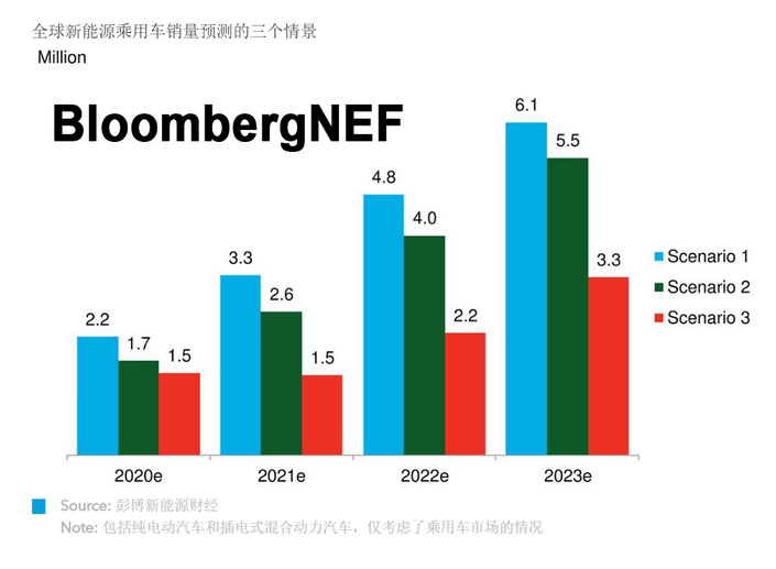 情景一是目前是最樂觀的情景。在此情景下,2020年全球新能源汽車銷量實際增長約3%;在政府出臺有力的應(yīng)對政策、市場對新能源汽車新車型需求持續(xù)增長的作用下,汽車市場得以迅速恢復(fù)。新冠疫情對2020年以后的新能源汽車銷量影響非常有限,2023年的新能源汽車銷量預(yù)計達(dá)到610萬輛。