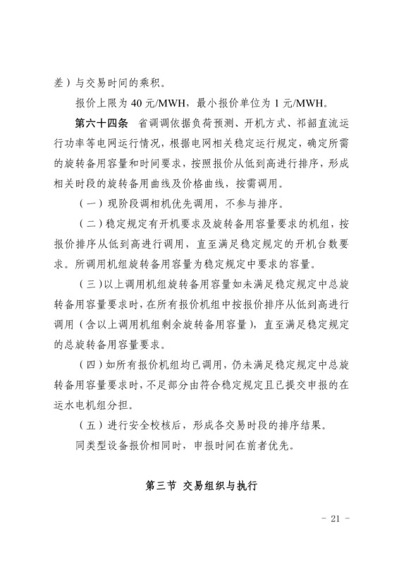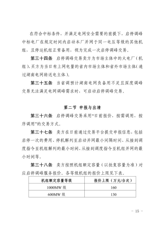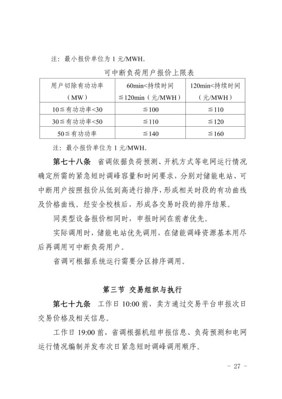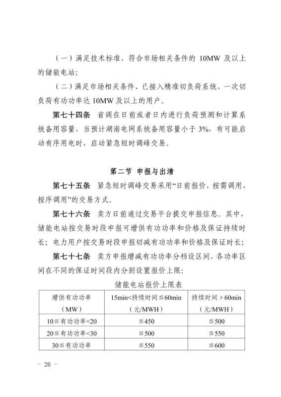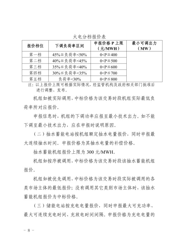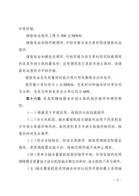 一、在深度調(diào)峰方面,火電機組、抽水蓄能、儲能電站分別報價,其中抽水蓄能報價上限為0.3元/KWh,儲能電站報價上限為0.5元/KWh,各類主體下限為0.01元/KWh。儲能電站如按序被調(diào)用,中標價格為該交易時段該儲能電站報價。儲能電站如被優(yōu)先調(diào)用,中標價格為該交易時段實際被調(diào)用的各類市場主體的最低價;沒有調(diào)用其它類別市場主體時,該儲能電站報價為中標價格。